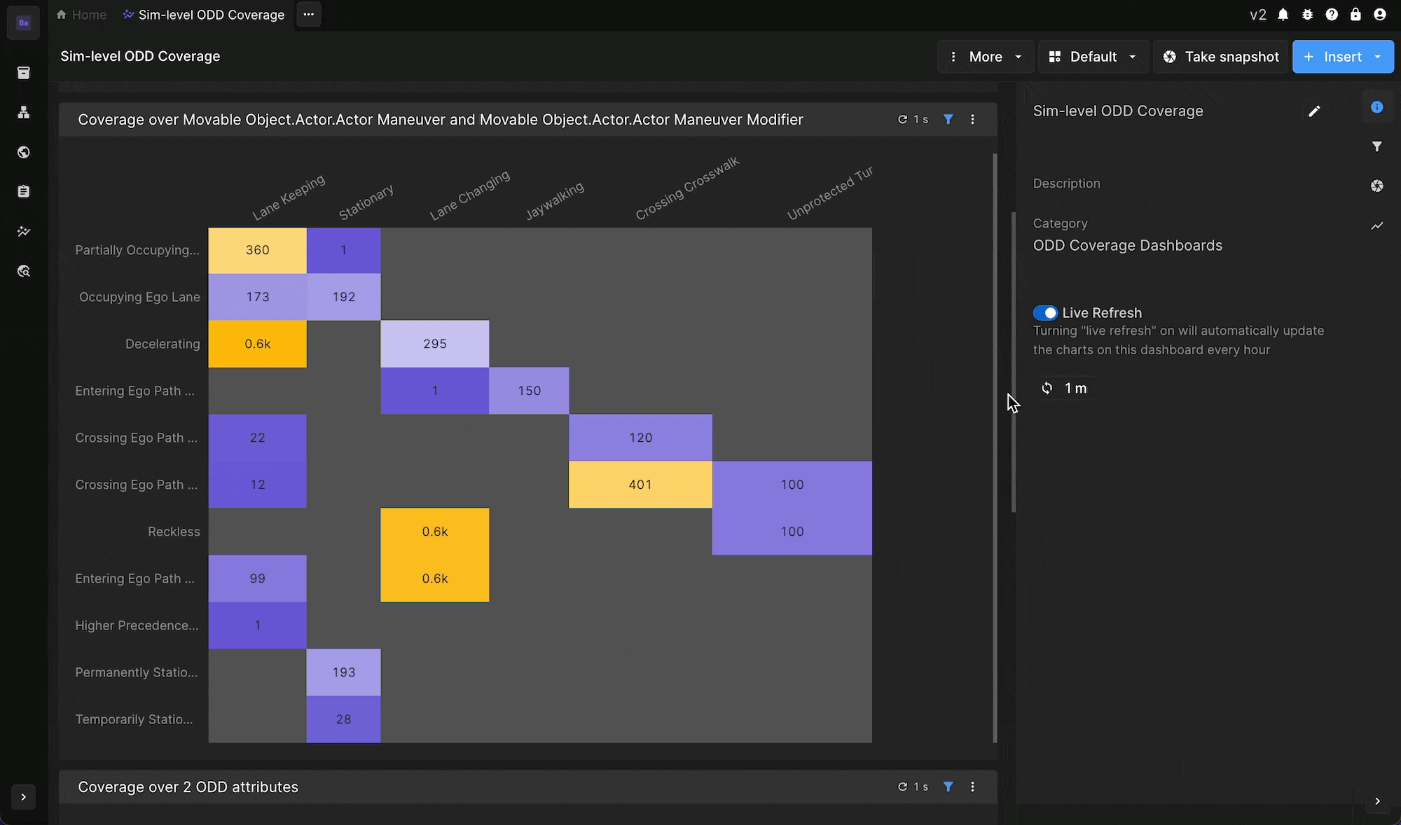 주행 데이터 및 시뮬레이션 아티팩트에는 환경 세부 정보, 도로 특징, 심지어 프로그램에서 요구하는 경우 액터 행동까지 포함한 정확한 ODD 속성으로 자동 또는 수동으로 태그를 지정할 수 있습니다. 커버리지 분석은 사용자 정의가 가능합니다. 팀은 간단한 매트릭스 검사, 심층 통계 분석 또는 고위험 조합에 대한 맞춤형 보고서를 실행할 수 있습니다.
